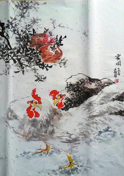 尽管他的画中多是情态迥异,活灵活现的家鸡,观者联想到的却是故园、老屋、家人;美丽的自然、活泼的生命,蓬勃的生活。鸡鸣犬吠之声是故园的声音,鸡飞狗跳之景是动人的场景,树鸡门狗之影是铭骨的烙印。葳蕤的翠竹,烂漫的菊花,金色的枇杷,火红的柿子,让你记住故乡的美丽和馈赠。色彩、线条,形态,巧妙的组合,交织成感人的情感,蓊郁的意境。一声声撩拨着你的心弦,一寸寸融化着你的身心,一点点洗涤着你的灵魂。你心甘情愿地沉溺其中,屏息、沦陷、飞翔。