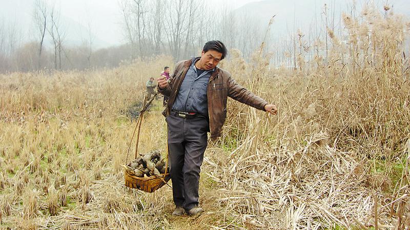 2015年12月底的天气,天寒地冻。在漫川关镇水码头村,62岁的李家宝正手持木铲,穿着齐胸高的防水服在荷塘里挖莲藕,身后留下了一个个收割后的深坑。在这样一幅单调的冬日素描里,他成了最能生动原野风情的音符,又仿若一个个小小的墨点,洇湿了乡村岁月中宁静的画面。