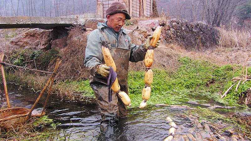 “都老了,一个冬天挣个3万块钱很满足了。”拿着刚刚挖出的莲藕,李家宝开心地告诉记者。望着大片的泥塘,李家宝每刨一个坑,下面准准的会有一窝莲藕。他的眼睛是一杆秤,只要一看藕塘里的荷梗粗细和生长情况,他就能估算出莲藕的长势和产量,八九不离十。因为整支的莲藕能卖出好价钱,所以他刨的特别仔细,顺着枯干的荷梗,用铁铲一路翻开淤泥,动作娴熟自如。一会儿工夫,一支莲藕探出一截胖乎乎的身子,抹去身上的泥土,宛如婴儿的手臂。寒风中,他小心翼翼地将莲藕捧在手上,就像对待自己的孩子一样。