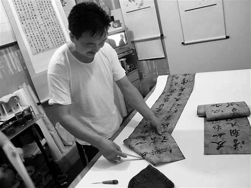 于是,他开始在冷清的日子里探索古旧字画修复。他翻出爷爷珍藏的一幅日本人手书的旧对联,将上联水浸后放在柜盖上,结果揭的时候却黏在柜盖上烂成了碎片无法收拾。他又找来塑料纸,将下联浸湿后覆在上面,成功之后,经过长达3个月的冲洗去污、揭旧补缀、修磨残口、矾挣全色、刺制裱绫、镶嵌绫绢、转边扶背、砑光上杆等繁复工序,残缺晦暗的旧作焕发了青春的光芒,他也初步掌握古旧字画的修复工艺。