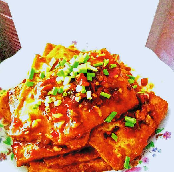 菜熟,起锅,用筷子夹一块豆腐,油汪汪一晃一晃的,送进嘴里,麻辣烫香,兼而有之。吃蒸馍的时候,有这样一盘菜,其他菜都成为可有可无的了。