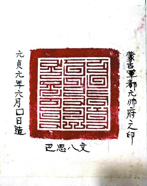 同年11月,县文化馆正式登记该文物,名称为“银印”,时代为“元代”,现状为“完整”,备注是“一级”,编号“0694”。该文物通长9.5厘米,柄高6.6厘米,面宽8.5厘米,重量2.2千克,质地为银质,印文为蒙古巴思八文,印面为正方形,面北左侧阴刻“中书礼部造”“元贞元年六月日”楷书两行,右侧阴刻“蒙古军都元帅府之印”9字。档案中捐献者是“孟开启”,但笔者曾多次到柏庵村调查,应是“孟开勤”,登记人误写成孟开启。