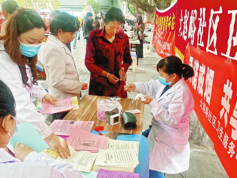 5月28日,市健康教育中心牵头,市中心医院、市疾病预防控制中心等单位在市区文化广场开展第34个世界无烟日宣传活动。今年世界无烟日的主题是“承诺戒烟,共享无烟环境”,活动现场医护人员免费为群众测量血糖、血压,发放宣传资料,普及烟草及其制品有害健康的知识,引导群众积极控烟禁烟。(任雯倩 摄)