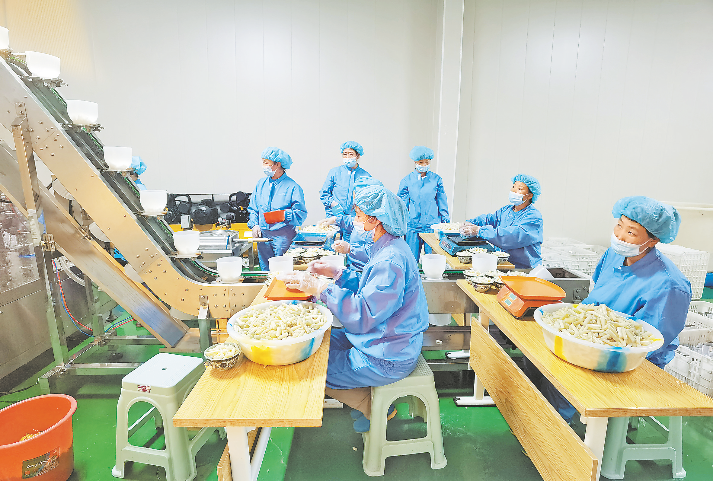 8月5日,陕西德胜农业科技有限公司的酱腌菜深加工生产线上,工人正在加工野生藕段。该公司成立于2016年,位于洛南县麻坪镇,总投资2200多万元,目前建有2条脱水蔬菜生产线、1条酱腌菜深加工生产线,日均加工鲜菜60多吨,有效解决了当地蔬菜种植的销路问题,带农富农效应凸显。 (本报记者 肖 云 摄)