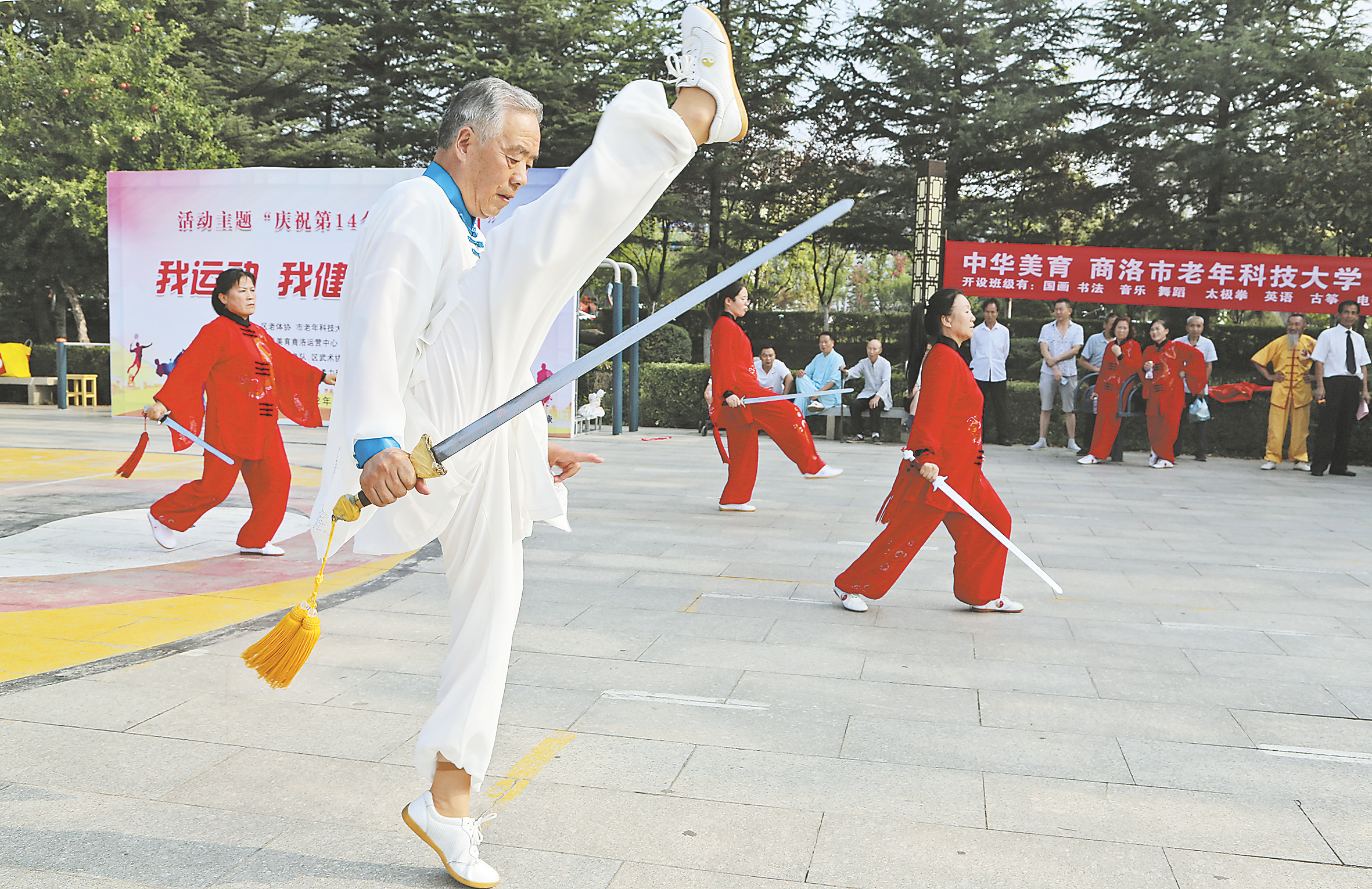 △8月6日,市老年科技大学、商州区老体协等单位联合举办以“我运动、我健康、我快乐”为主题的展演活动。商洛蓝健身队、鸿萱柔力球健身队、玉兰花开健身队等6支队伍以展演的形式庆祝第14个“全民健身日”。 (本报记者 杨 鑫 摄)