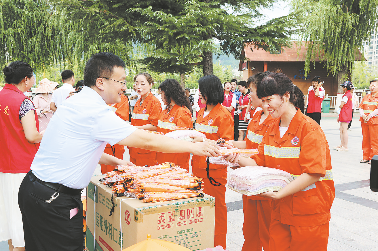 8月9日,由市慈善协会、市总工会、市妇联主办的“送清凉、献爱心”活动在市区丹鹤楼广场举行。本次活动向环卫工、交警、工地工人等室外工作人员捐赠了毛巾、矿泉水、西瓜等价值4.7万多元的防暑降温物品。 (本报记者 谢 非 摄)