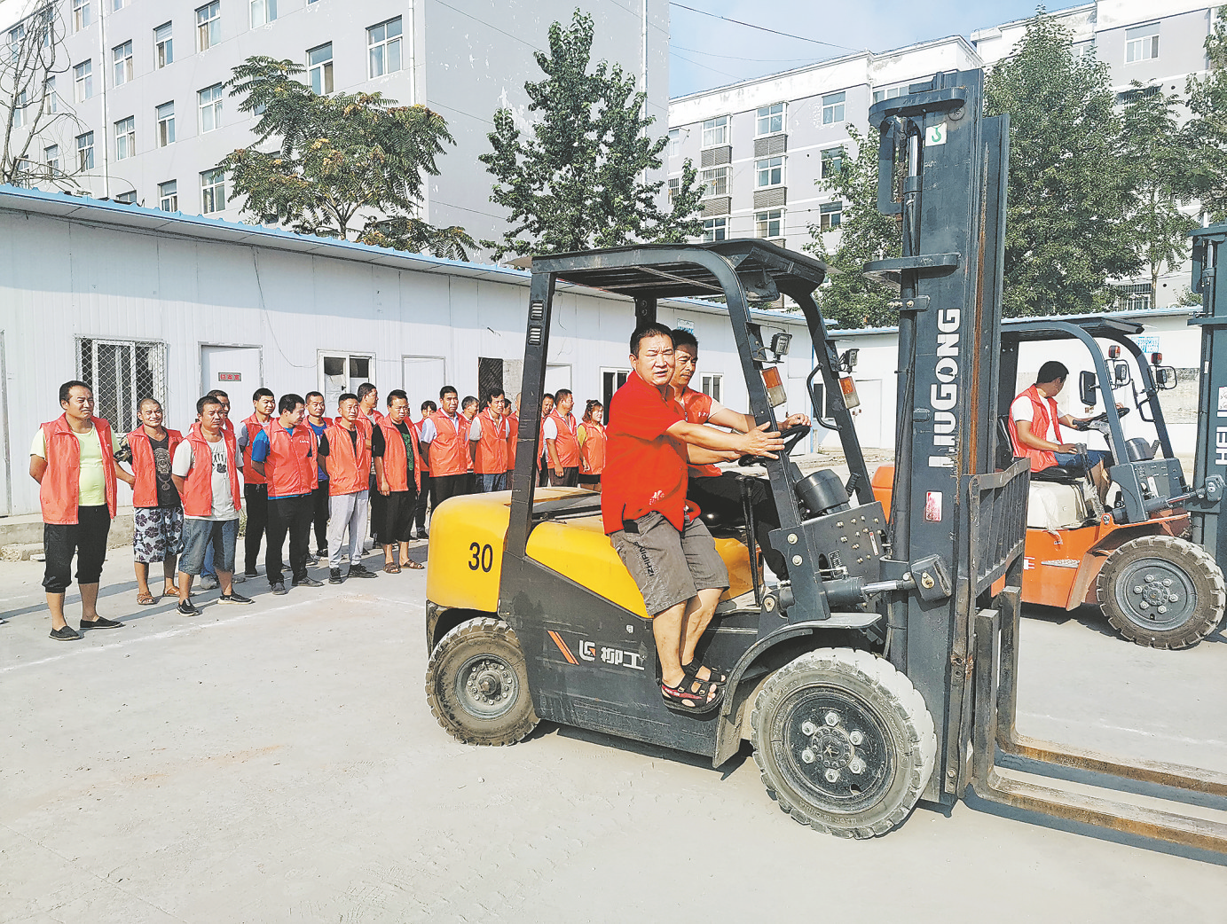 8月4日,洛南县景村镇的农民学员在叉车培训班学习驾驶技术。据了解,该培训班由洛南县人社局和洛南县苍松职校联合举办,免费培训学员35名、时长25天,每天为学员发放生活补助。 (本报通讯员 郭夏季 摄)