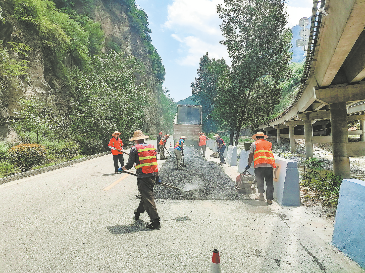 8月8日,市公路局镇安公路管理段组织养护队伍,对G211国道辖养路段坑槽、沉陷等公路病害开展集中修补,有效提升了路况及路容路貌,保障了辖养公路的安全畅通。 (本报通讯员 潘 妮 摄)