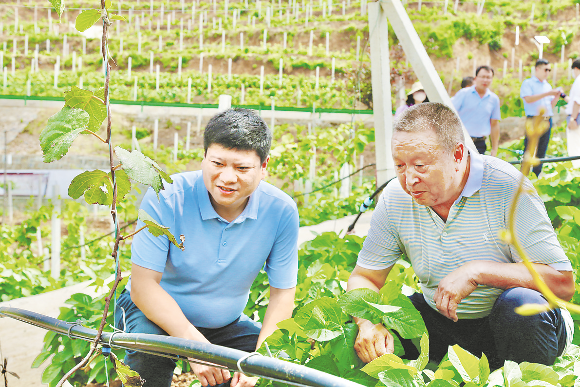 雨花台区对口帮扶丹凤县联络组组长、丹凤县委常委、副县长薛伟在猕猴桃种植园查看猕猴桃生长情况。