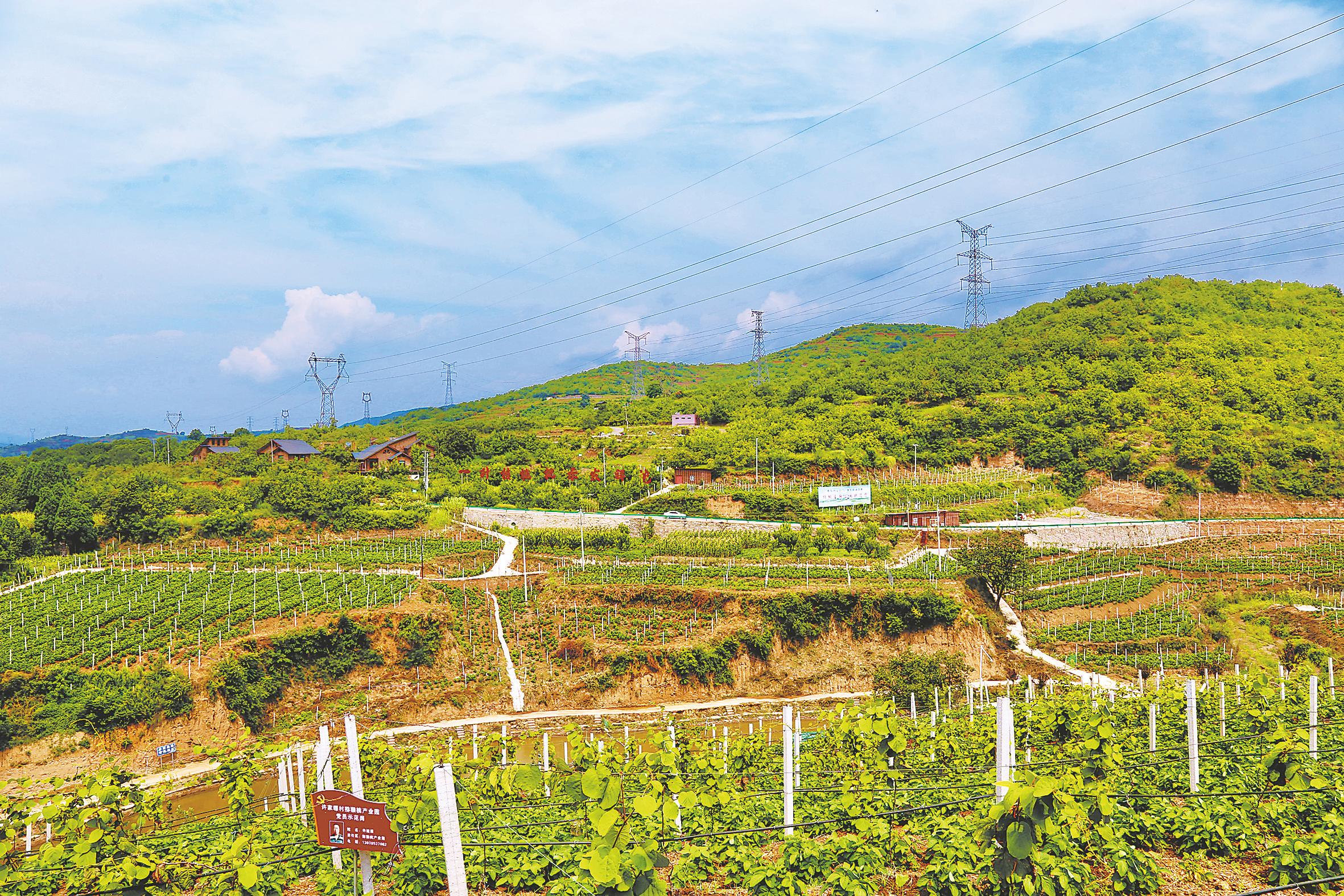 与核桃主题园隔山相望的猕猴桃和葡萄产业园中,果木长势旺盛,藤蔓已经开始爬架,村民套种的大豆也结满了豆荚。