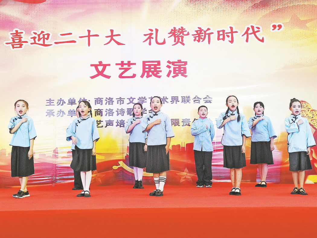 8月14日,由市文联主办、商洛诗歌学会协办的“喜迎二十大 礼赞新时代”文艺展演在商州艺声培训学校举行。师生们展演了舞台剧《我的国,我的家》、情景朗诵《请党放心,强国有我》等20多个文艺节目。 (本报记者 贾书章 摄)