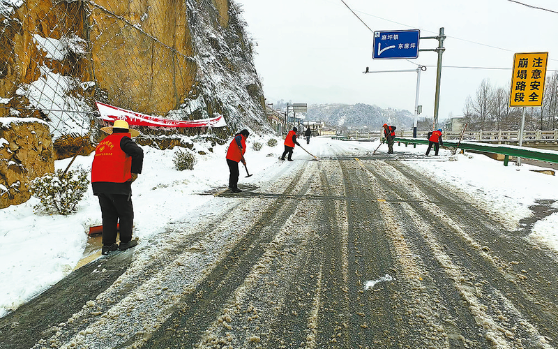 1月15日,一场大雪使洛南县银装素裹,造成道路积雪和结冰。为了消除安全隐患,洛南县麻坪镇积极组织党员干部、志愿者及广大群众,带着铁锨、扫把等工具,对辖区主干道进行扫积雪、铲冰层、除路障,确保群众出行安全,受到了群众的一致称赞。 (本报通讯员 毕波波 摄)