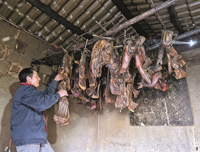阴乐家里现在养了11头猪,它们每天吃的是粮食和菜,个个长得膘肥体壮。每年的10月份之后,天气渐渐转凉,阴乐家里都会请村里的杀猪匠来杀猪,左邻右舍都会来帮忙。新鲜猪肉要先均匀抹盐,再加上阴乐父母调制的“独家秘方”调味料,腌制24小时。然后,用绳子把腌制好的肉挂起来,在密封的房子里晾48小时,直到把水分晾干。