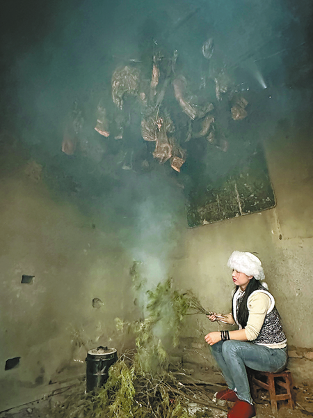 镇安人做腊肉要经过烟熏这道程序。阴乐和父母每天都会抽出三五个小时,用湿的锯末和柏树叶,在晾干的猪肉下生起小火,让飘起来的烟雾熏烤猪肉。就这样坚持熏2至3个月,直至肉皮变成红色。