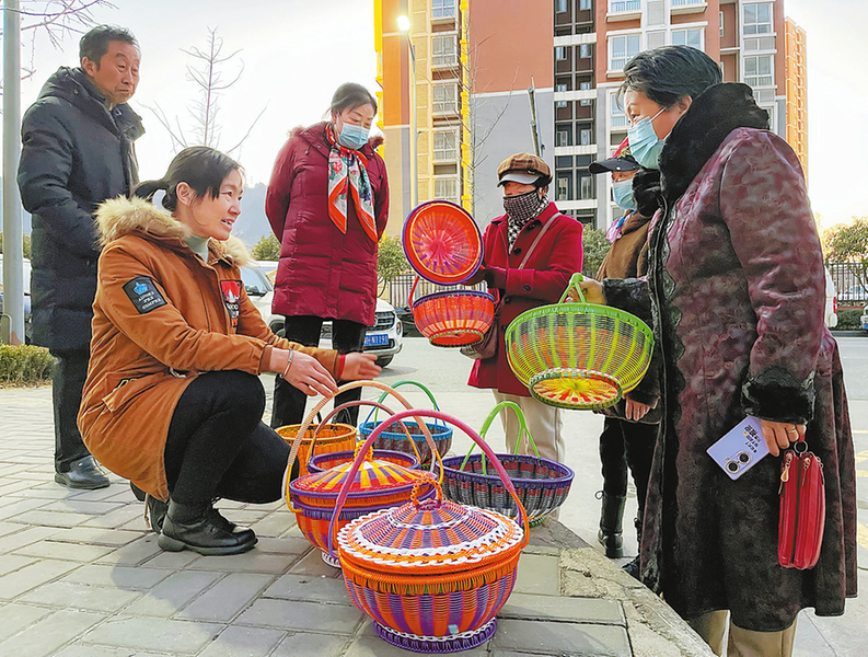 1月7日,记者在市区惠民东路街边见到手艺人敏锋时,她正热情地向顾客介绍自己的手工编织篮,不一会儿她带来的篮子便销售了一半。