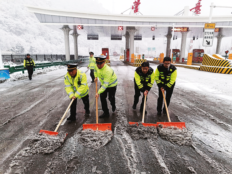 16日,记者从省路政执法总队第十支队了解到,降雪后路政执法人员第一时间在营盘收费站外进行除雪保畅行动,同时与陕西交控西镇分公司柞水管理所工作人员共同进行闸道除雪,现场引导大客车出站,为滞留司乘人员提供热水。