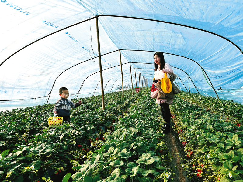 1月13日,在商州区夜村镇于塬村的绿缘生态农业休闲园,草莓进入采摘季,不少游客和市民带着家人朋友来此采摘草莓,寻觅冬日乐趣。 (本报记者 杨 萌 摄)