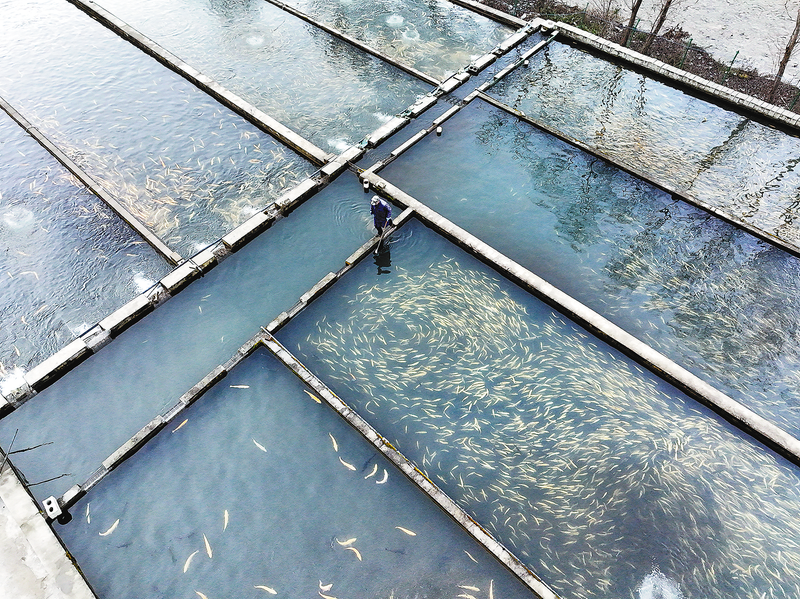1月20日,在镇安县高峰镇渔坪村,商洛宝东养殖有限公司的鱼池里,密密麻麻的冷水鱼欢快地游来游去,时不时有几尾跳出水面。