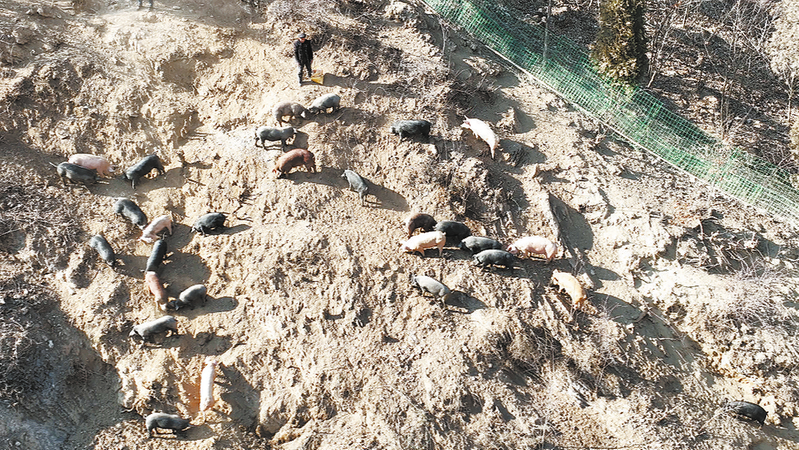 1月12日,笔者走进山阳县漫川关镇康家坪村跑山猪养殖场,映入眼帘的是漫山遍野的跑山猪,或三五成群低头觅食,或静卧安静晒太阳。随着饲养员一声吆喝响起,养殖场内的跑山猪从四面八方聚拢过来准备“进餐”,场面甚是热闹。