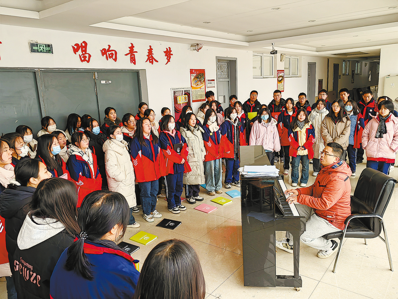 随着合唱团的成立,学生单调的校园生活变得鲜亮起来。但合唱重在合字上面,各个声部单独练习后缺少配合、钢琴伴奏与其他人缺少沟通等问题浮现了出来,郭军辉便一点一点为他们解决问题,逐个、逐部分进行调整。“我弹钢琴伴奏时和大家配合不当,郭老师就帮我磨合,还教我演奏时的情绪表达。”高二(23)班学生李沫萱感激地说。