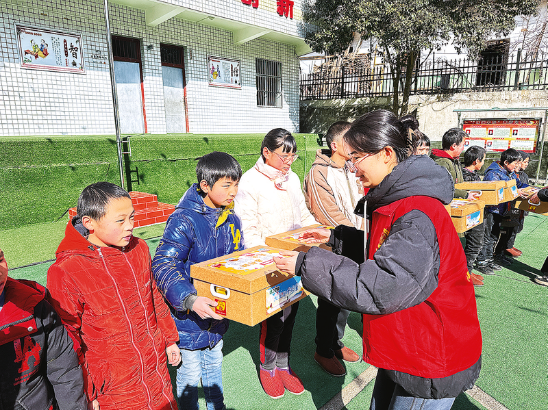 1月23日,陕西省社会福利事业发展基金会联合山阳县爱心公益志愿者协会,在山阳县色河铺镇花栗沟小学开展“情系山区绽放爱心”志愿服务活动,为学校34名留守儿童送去了图书、饭盒、洗衣液、手套、围巾、足球、篮球等。 (本报记者 方 方 摄)