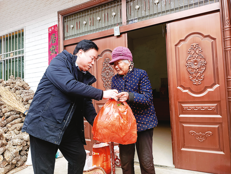 近日,洛南县三要镇北司村党支部书记丁锁子,将自家闲置的烤烟育苗大棚里种植的400多公斤蔬菜采摘后,为全村所有的孤寡、留守老人送上门,解决他们在降雪降温天气买菜难的问题。