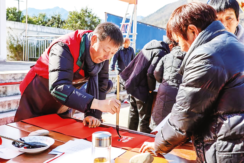 △1月23日,市文化馆工作人员及多名书画家来到商南县金丝峡镇白玉河口村,举办“欢欢喜喜过大年 春到万家2024义写春联”活动,为群众现场书写新春对联600多副。 (本报记者 谢 非 摄)