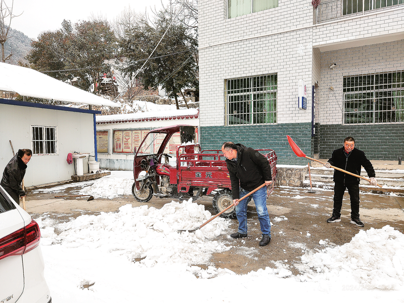 二月二十六日,为有效保障道路通畅,方便人民群众出行,山阳县王阎镇组织干部职工全员上阵,扫雪除冰。广大干部职工不畏严寒,挥舞着铁锹、扫帚,清路旁积雪,忙碌的身影构成了一道亮丽的风景线。(本报通讯员蔡彦君摄)