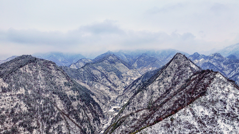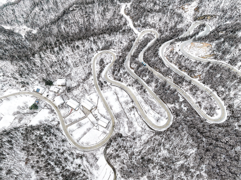2月23日,俯瞰丹凤县界岭,雪后的盘山公路犹如一条银蛇蜿蜒而上。 (本报通讯员 郝建勋 摄)