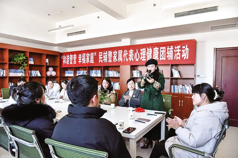 杨华(右二)在“和谐警营 幸福家庭”民辅警家属代表心理健康团辅活动上发言