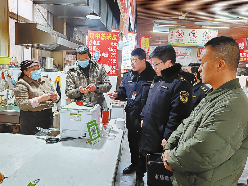 2月28日,丹凤县初级中学联合龙驹市场监管所对学生营养餐供餐点、小饭桌的相关资质、食材采购、食品加工等进行了突击检查,对存在的问题及时指出,限时整改。 (本报记者 肖 云 摄)