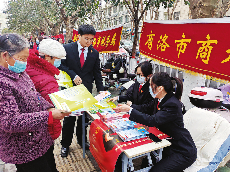 为进一步深化我市广大妇女的法治和维权意识,3月1日,市级和区级各相关单位开展“三八”妇女维权周宣传活动。图为商州区人民法院工作人员向群众发放宣传单,并解释相关法律内容。 (本报记者 南 玺 摄)