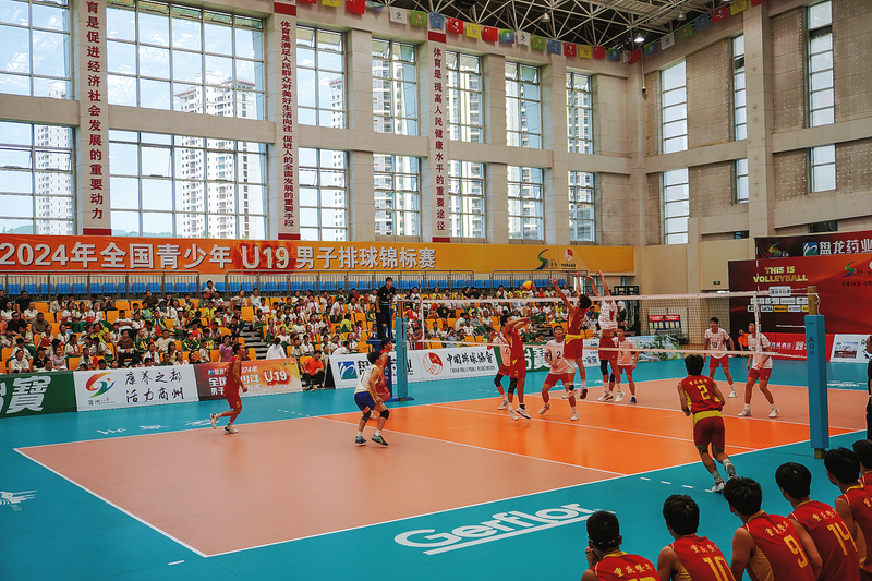5月14日,2024全国青少年U19男子排球锦标赛在商洛火热开赛,共有来自上海、江苏、辽宁、福建、重庆等地18支队伍400多名运动员参赛。图为14日,在商州区体育馆中,浙江大学附属中学队与重庆市暨华中学队正在进行激烈比赛。 (本报记者 南 玺 摄)