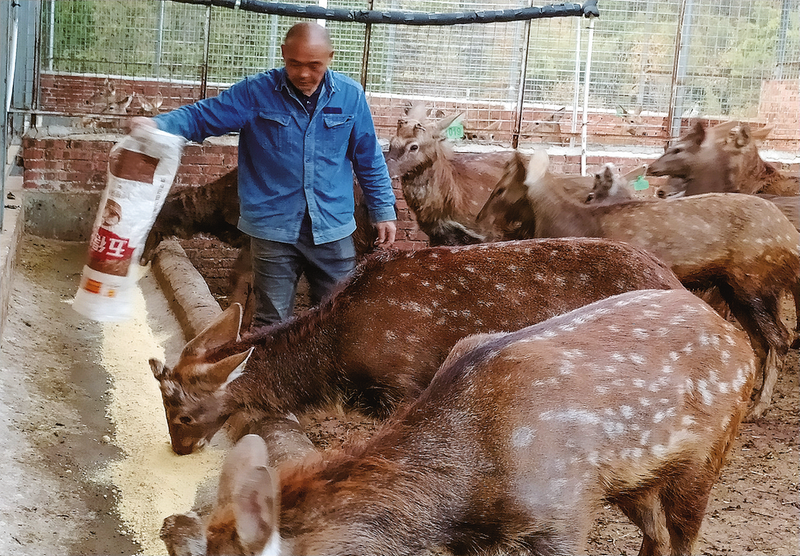 “我在这里干活一个月工资 3000元,比出去打工强多了。”脱贫户刘益民是这里的饲养员,对于如何养鹿说得头头是道,“一天需要给鹿喂3次粗饲料,就是玉米、大豆秸秆等,同时还要喂精饲料,是专门在湖北买的,混合着喂梅花鹿长得好。”