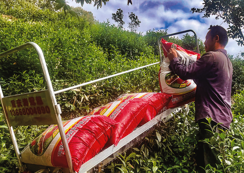 “由于茶园海拔高、山地陡峭,以前运输肥料、茶叶、机械用具等,需依靠青壮人力背送,一袋80斤的肥料从山下背至山顶至少需要30分钟,现在有了轻轨运输车,几分钟便可完成运输任务,现代化科技设备应用大大提高了生产效率。”雨山茶叶专业合作社工人曹绍锋说。