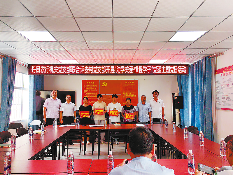 ▷8月20日,丹凤农行机关党支部联合武关镇坪安村党支部开展“助学关爱·情暖学子”党建主题党日活动,现场资助今秋新入学的4名困难家庭大学生每人1000元。 (本报通讯员 袁汉锋 摄)
