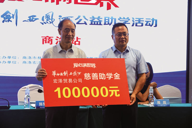 ◁8月21日,市慈善协会、华山论剑西凤酒2025年慈善公益助学活动仪式在商洛国际会议中心举行,华山论剑品牌管理有限公司、商洛市宏泽贸易有限公司为100名商洛学子捐赠助学金10万元。 (本报记者 耿 锟 摄)