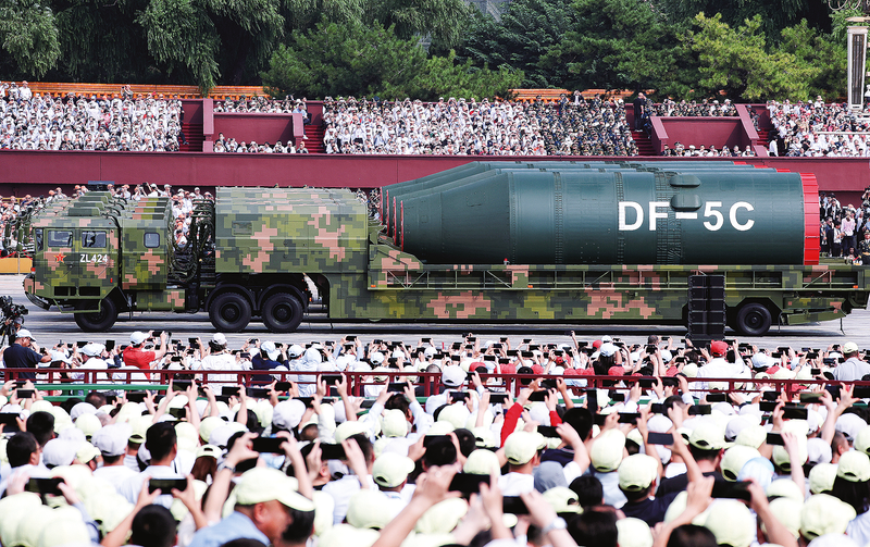 宽阔的长安街向远处延伸,以“复兴”命名的道路平直如砥。受阅官兵昂首挺胸、步履铿锵,向着强国强军的光明前景前进。