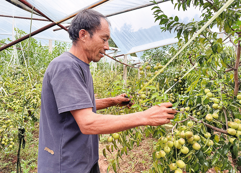 9月4日,丹凤县龙驹寨街道冠山村冬枣种植基地里,工人正有条不紊地为冬枣树进行打芽作业。据了解,该基地冬枣种植面积2公顷,预计年产量2万公斤。通过村集体经济合作社的运营管理,冬枣的品质与产量有保证,周边群众也在此务工增收。 (本报记者 方 方 摄)