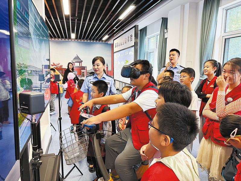 最受欢迎的环节是步行机VR仿真模拟体验。“日常生活中,你们是怎样过马路的?谁想来试一试?”民警赵运航提问的话音刚落,小记者便争相举手参与。几名小记者在民警的指导下佩戴VR眼镜,通过跑步机应对虚拟道路中突发的交通状况,作出了正确反应。“坐校车时不能随意走动,大声喧哗,打扰司机师傅开车。”在校车逃生体验区,小记者面对民警的提问,积极回答,并学习如何使用逃生锤砸窗自救。