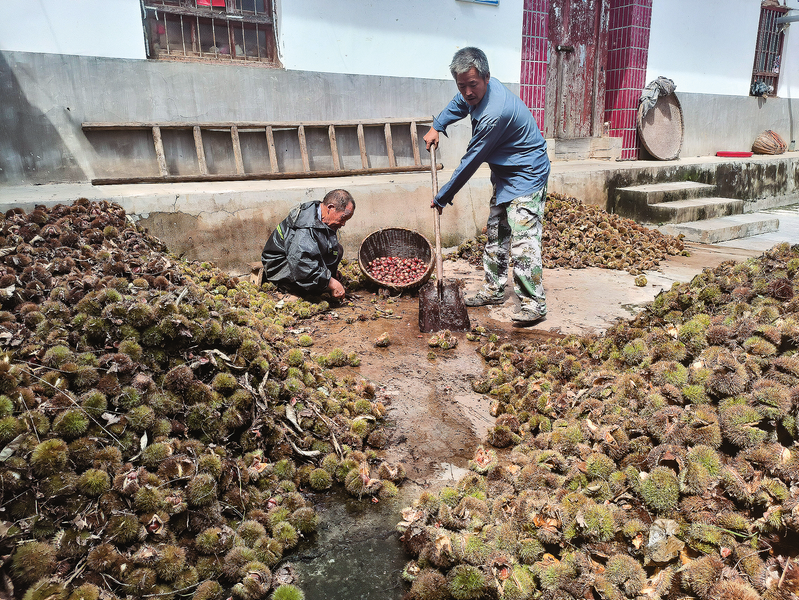 9月12日,镇安县庙沟镇双喜村四组村民李成兵忙着给板栗脱壳。镇安县素有“中国板栗之乡”之称,今年全县62万亩板栗喜获丰收,预计产量10000吨,产值1.5亿元。 (本报记者 马泽平 摄)