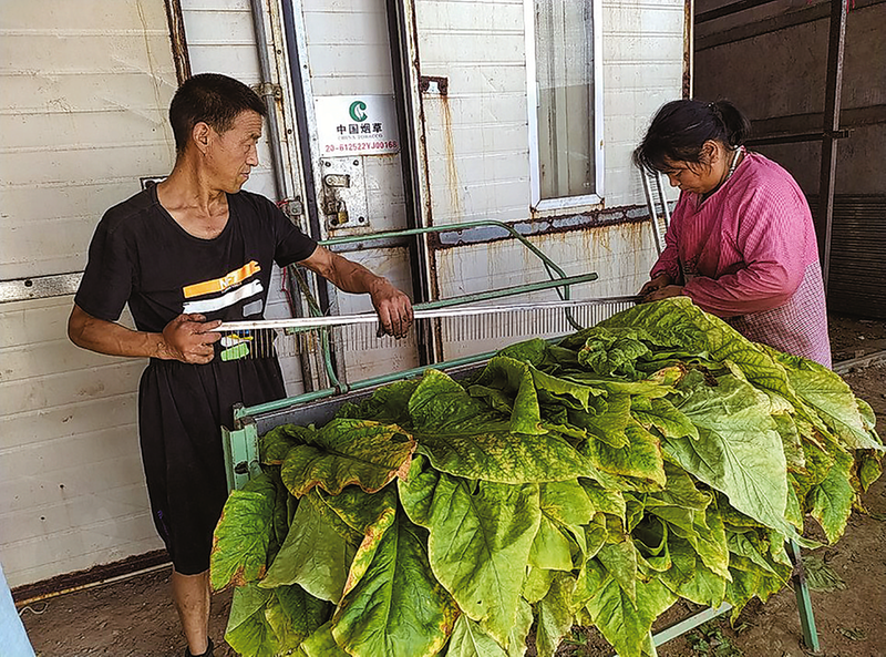 8月30日,洛南县城关街道王滩村烤烟种植户在编烟叶准备烘烤。该村从2019年发展烤烟产业,现在种植烤烟1100多亩,其中30亩以上大户有34户,仅烤烟一项,全村预计毛收入640多万元。 (本报记者 贾书章 摄)