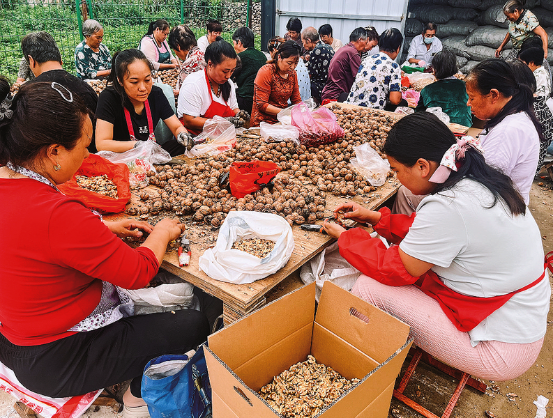 连日来,丹凤县新新旺农产品有限公司在竹林关镇洞底村设点招工,组织村民集中剥核桃仁。据了解,公司每天用工约80人,村民人均日收入40元,用“家门口的岗位”让群众轻松实现增收。 (本报通讯员 王 蒙 摄)