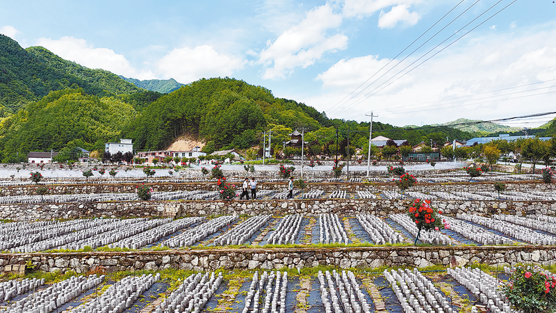 △9月6日,柞水县下梁镇老庵寺村木耳种植基地与蓝天白云相映成趣,一排排菌棒整齐排列,勾勒出一幅生机盎然的田园画卷。