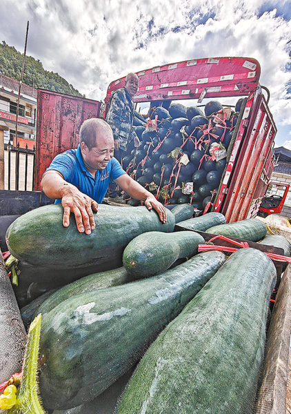 ◁9月14日,商州区牧护关镇泉源村80亩冬瓜基地一派丰收景象。据测算,该基地今年冬瓜亩产突破1万公斤,为种植户带来满满收益。