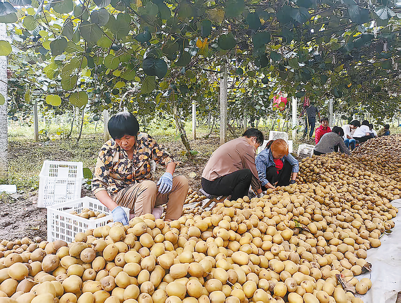 △日前,商南县富水镇的猕猴桃迎来采摘期。图为9月17日,王家庄村的种植基地内,村民正在分拣猕猴桃。