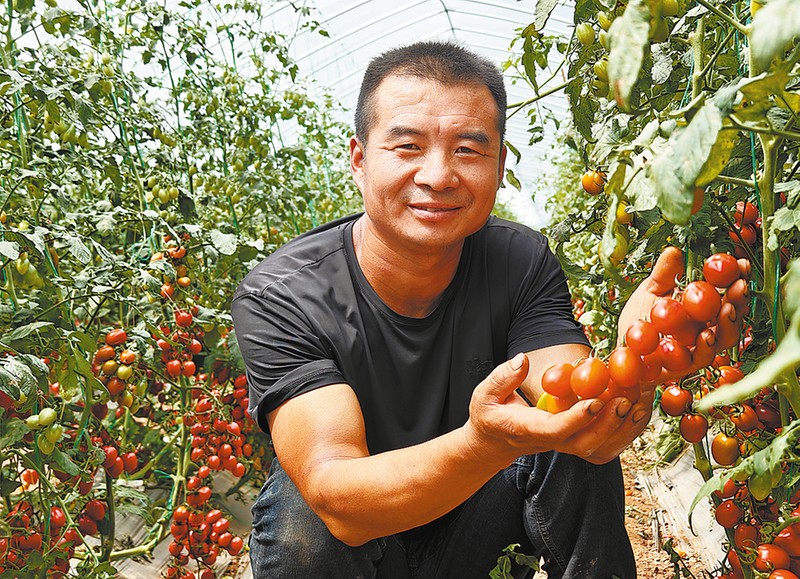 △9月16日,洛南县四皓街道连河村瓜果种植采摘基地内,圣女果藤蔓上缀满了果实,技术员罗鹏在查看圣女果长势。