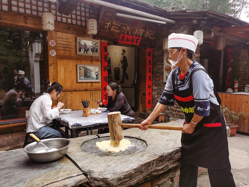 仲秋时节,秦岭层林尽染,色彩斑斓。牛背梁山脚下的柞水县终南山寨里,64岁的蔡定顺一边捶打着糍粑,一边哼唱着柞水渔鼓:“八月十五月儿圆,终南山寨焕新颜。木槌落臼青石上,糍粑香漫白云间。板栗核桃咧嘴笑,桂花染秋商洛山。模具翻转打月饼,中外游客忙点赞……”