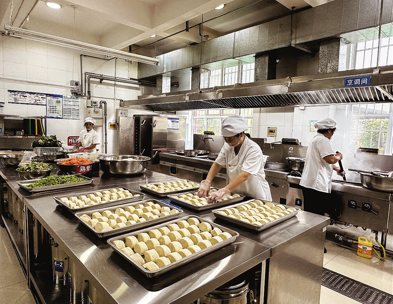 在西关幼儿园食堂操作间,记者看到餐台和餐具干净整洁,厨房工作人员均严格遵守食品安全规范佩戴口罩、帽子及一次性手套。刚出锅的馒头整齐摆放在餐台上,工作人员正紧张有序地准备午餐的炒菜和米饭。