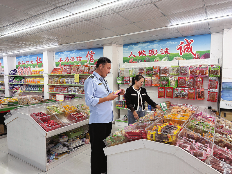 为保障中秋、国庆双节期间食品安全,9月24日,丹凤县竹林关镇市场监管所执法人员深入辖区商超、农贸市场及餐饮单位,重点检查月饼、粮油等食品,确保群众买得放心、吃得安心。 (本报通讯员 陈 庚 摄)